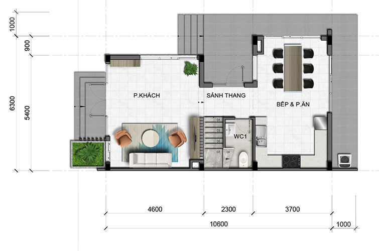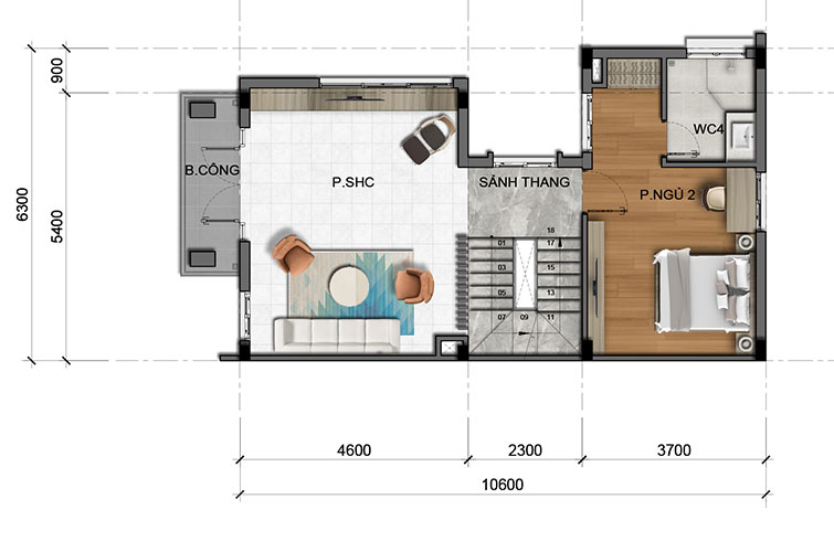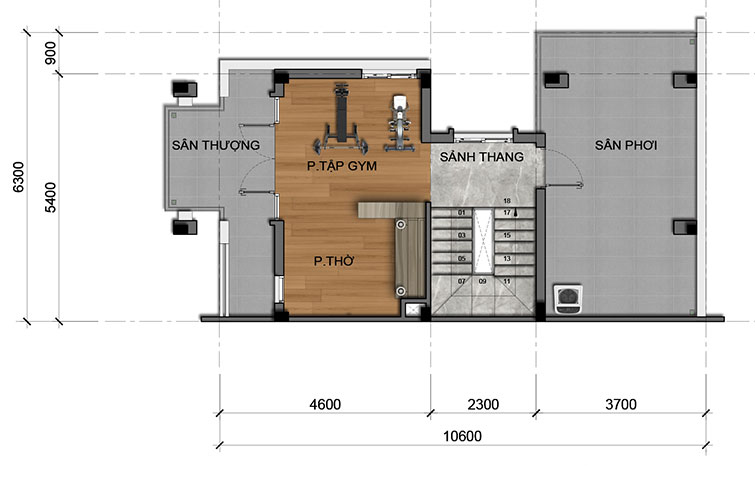 Số lượng tầng: 1 trệt + 3 lầu + mái